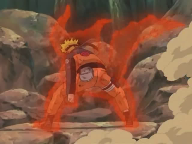 Di alam bawah sadarnya naruto terhasut oleh kyuubi untuk membuka segelnya dan hampir berubah sepenuhnya menjadi ekor 9 disaat genting seperti itu ayahnya minato namikaze muncul dan menghentikannya. Jika naruto mengambil terlalu banyak chakra maka kestabilan pikirannya akan terganggu dan tubuhnya akan berubah menjadi sebuah monster. Mata kyubi dalam tahap ini wujud naruto belum mengeluarkan cakra kyuubi.